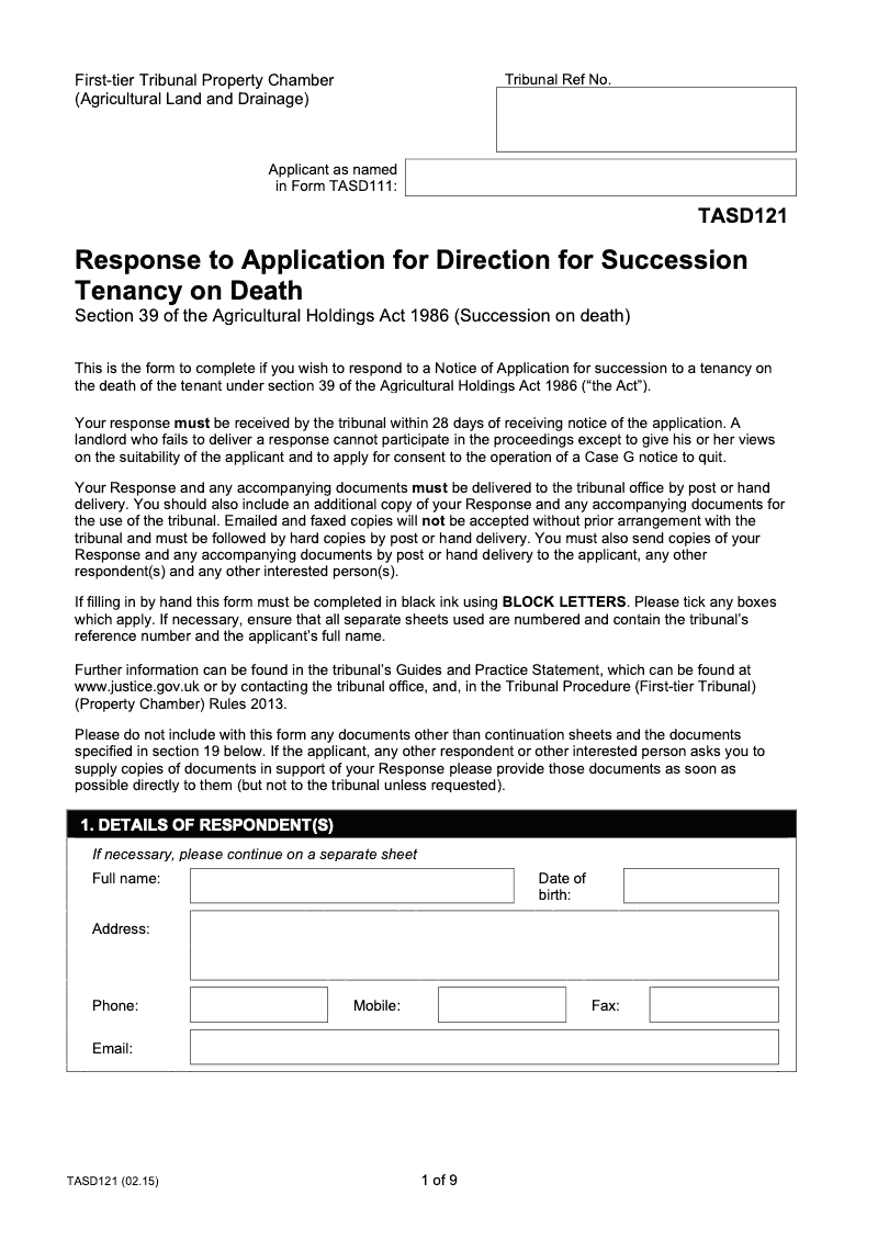 Response to Application for Direction for Succession Tenancy on Death - Section 39 of the Agricultural Holdings Act 1986 (Succession on death) (Agricultural Land and Drainage) - electronic signature available
